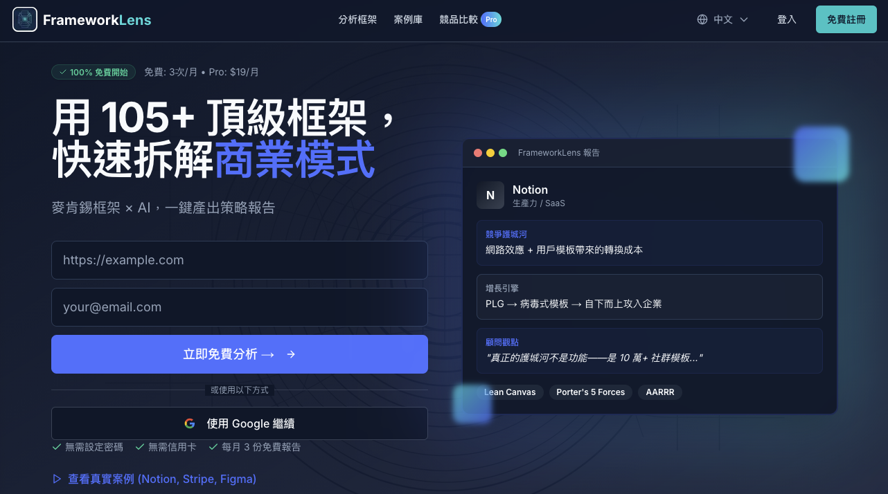 我開發 FrameworkLens,就是希望將那些原本只屬於頂級諮詢公司的分析能力,普及化給每一個正在為夢想奮鬥的人。