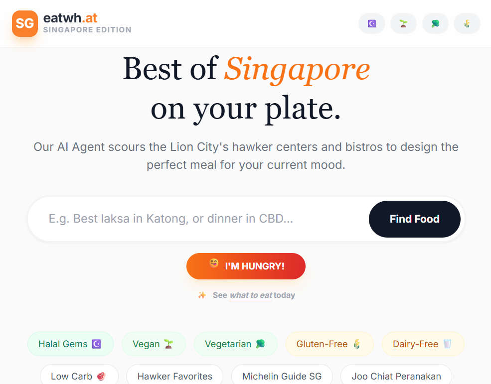 eatwh.at is an experimental playground created to push the boundaries of "AI Grounding." Most food apps are static databases; this app is a living, breathing agent that scours the web in real-time to find what's actually trending in the hawker stalls and hidden bistros of Singapore today.